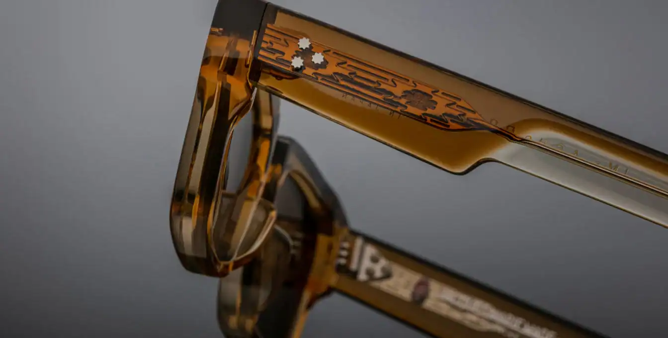 A rectangular frame with sharp lines and sculptural temples, in which the exposed core wire is decorated with intricate patterns inspired by Native American art. It is a bold design that breaks the mould and emphasises individuality.