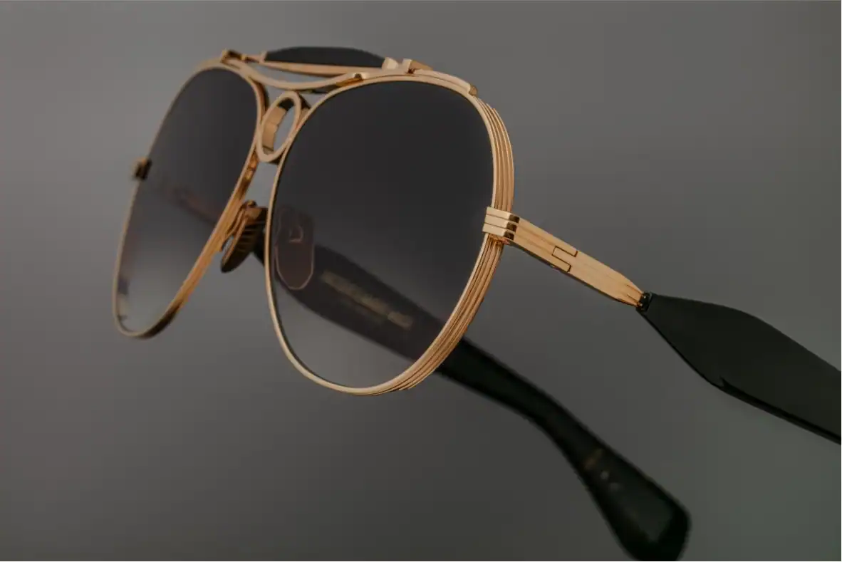 Made from dark gold titanium (100% beta-titanium) and decorated with elements from black Marquina acetate, the glasses delight with their subtle contrast and depth of colour. Characteristic upper acetate band and carved side pieces give the whole a structural, architectural character, and refined details – such as nose pads with logo and hairline engraving – demonstrate the craftsmanship and philosophy of Jacques Marie Mage.