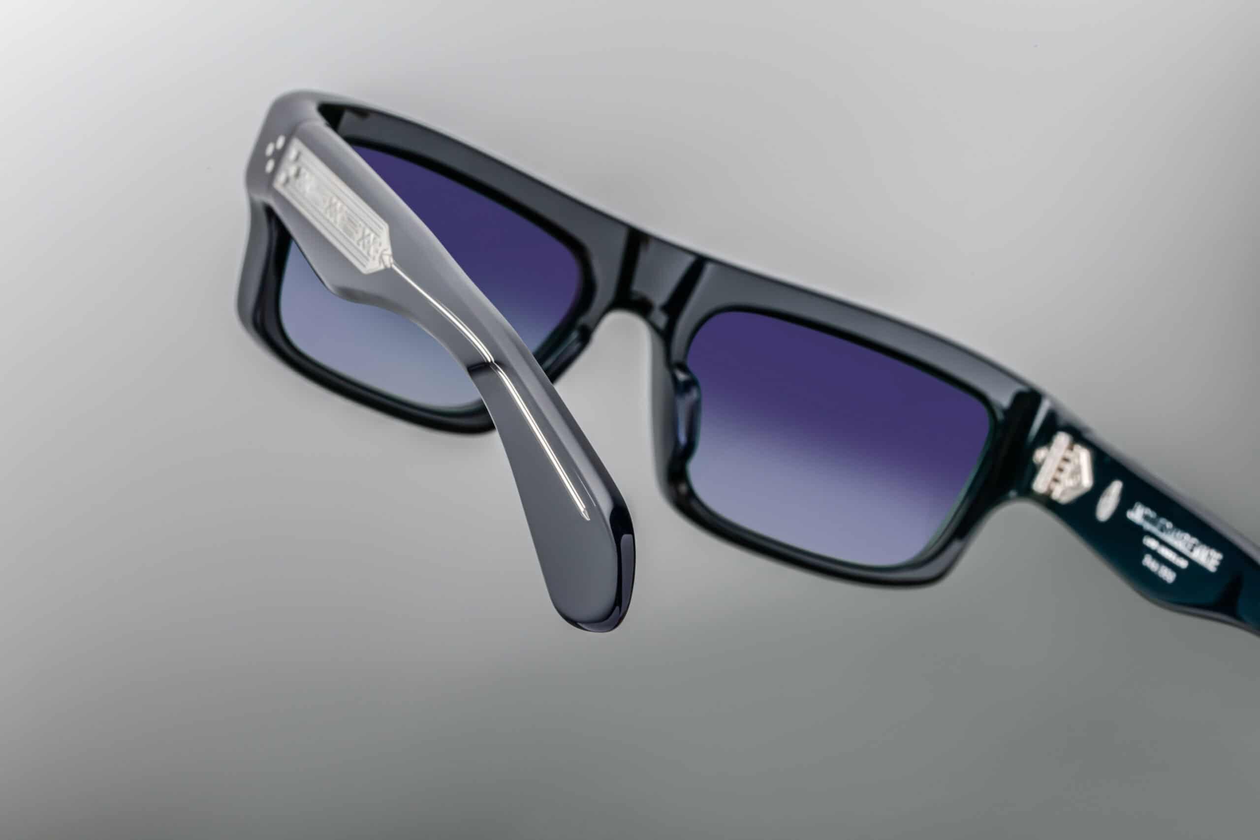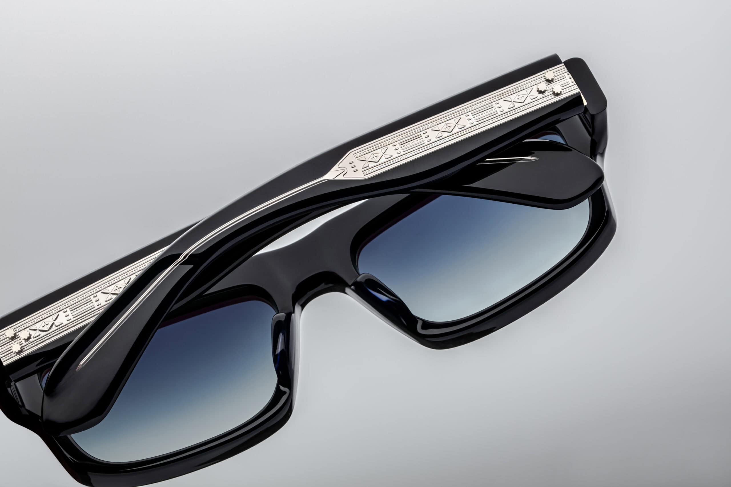 Handmade in Japan from 8-millimetre hardened acetate in a deep blue shade, delight with their sculptural form, rich volume and subtle effect of enveloping the face. Their double-laminated temples with metal details made of precious metals and blue lenses with a gradient finish create a harmonious composition of luxury, precision and expression.