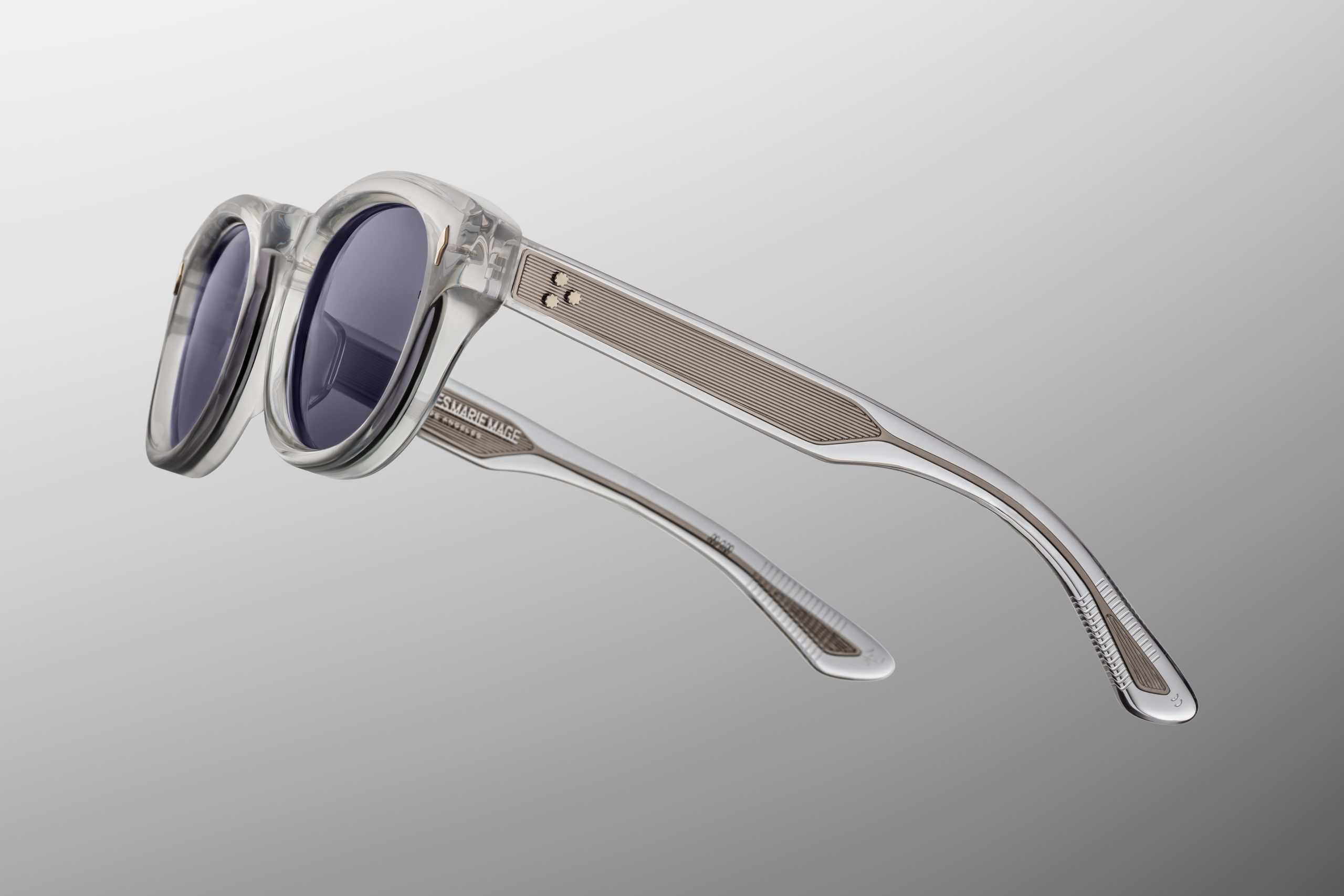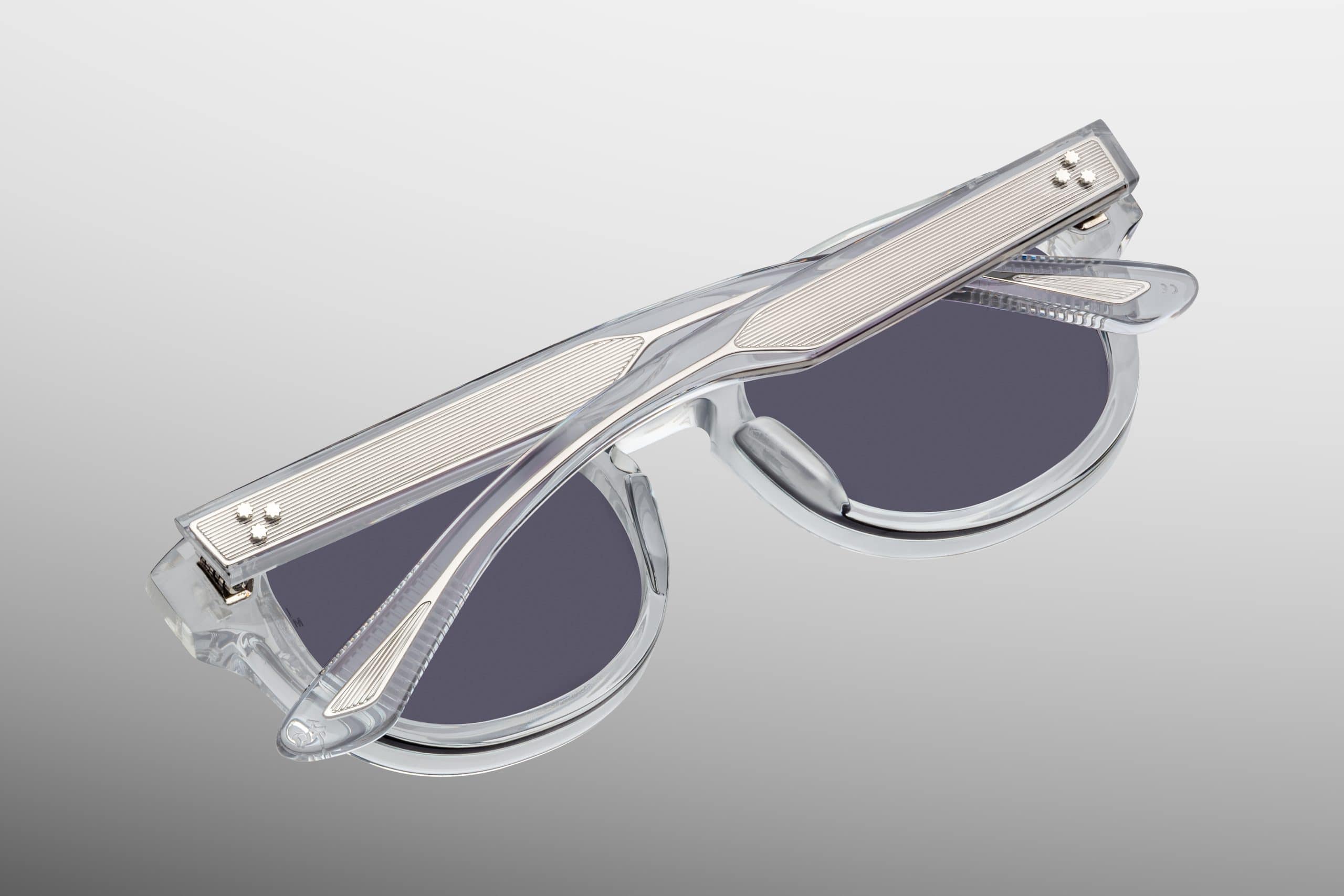 Variant SULPHUR made from 10-millimetre hardened cellulose acetate in a polished crystal grey-graphite tone. The transparent structure reveals the craftsmanship of the construction and the precision finish. wirecores with engraved Art Deco details, which are one of the most collectible elements of this model.