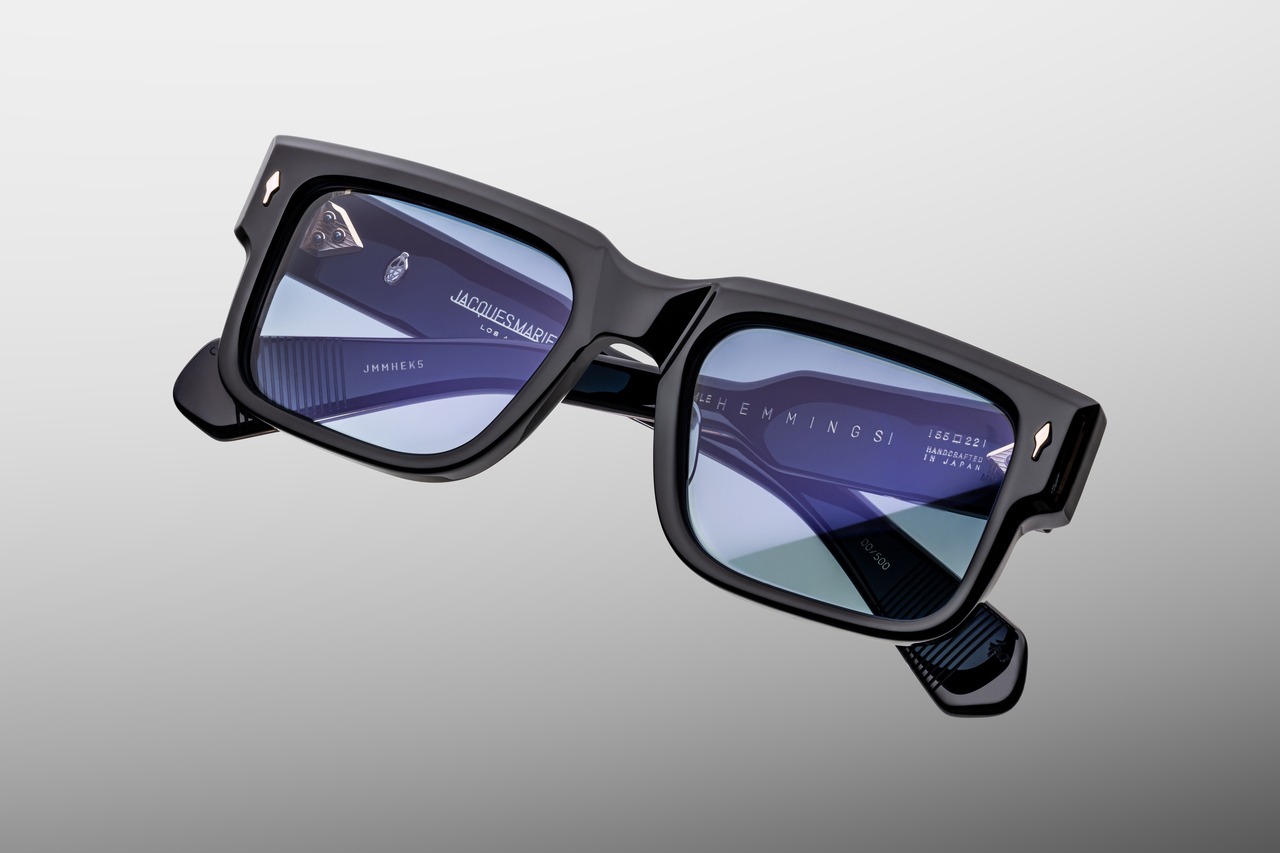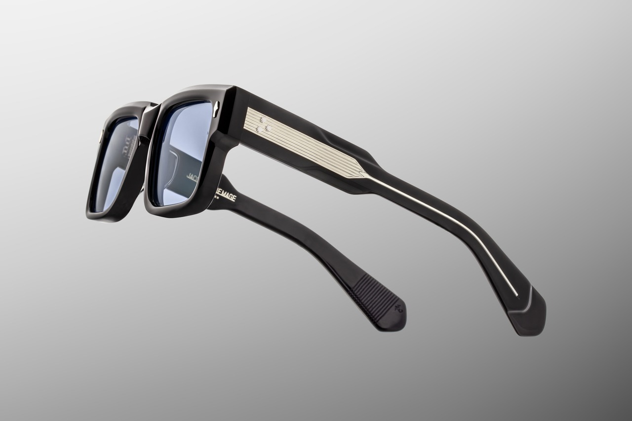 Model was made z 10 mm utwardzanego acetate celulozowego w kolorze czarnym i highlights get solidną konstrukcją and dopracowanymi detalami. Zauszniki z podwójnie laminowanego acetate skrywają odsłonięty silver wire core z grawerem hairline, a whole complement autorskie, srebrne zawiasy 9-barrel hinge mocowane naprężeniowo. Charakter luminaires highlight blue lenses gradient CR39 o bazie 6 z tylną powłoką antyrefleksyjną, which nadają model elegancki, somewhat tajemniczy wyraz.