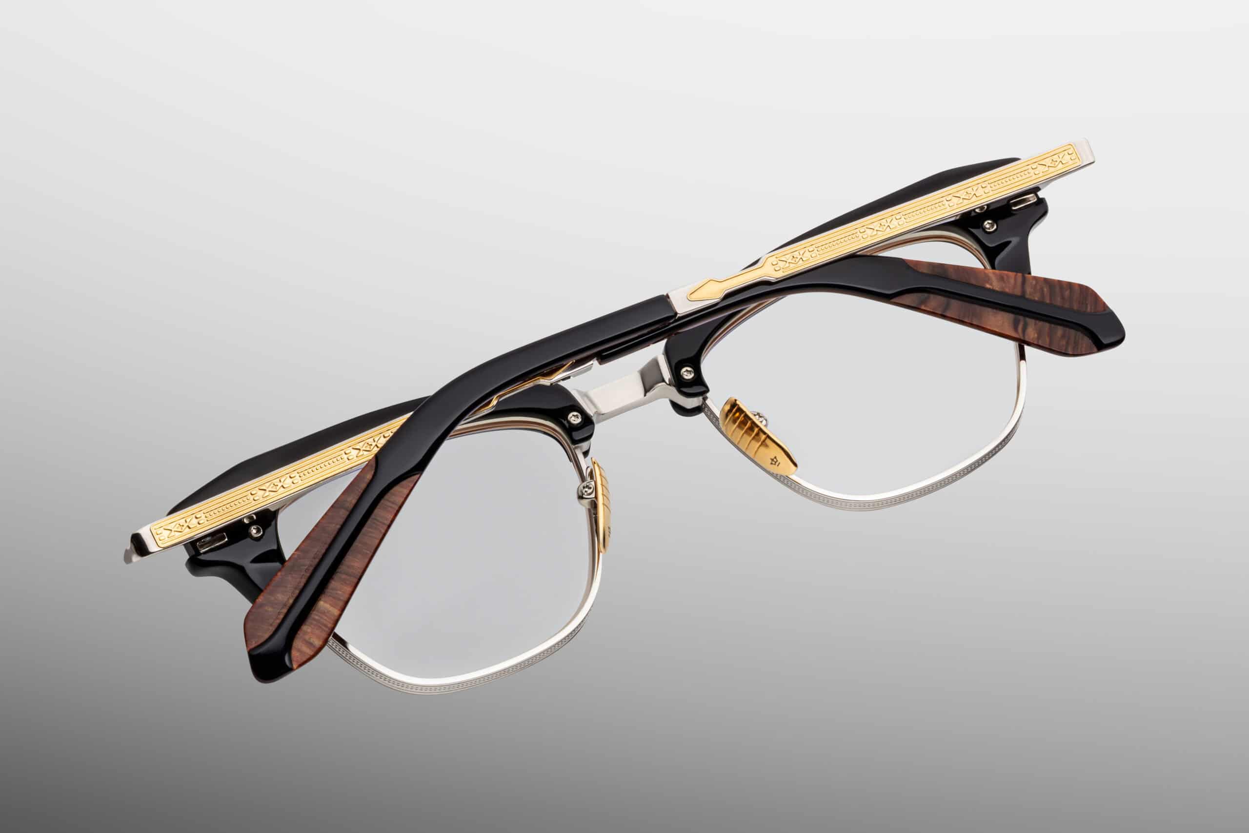 Handmade in Japan from 100% beta grade titanium, connecting frames round hoops with Art Deco engraving, monoblock hinges with an arrow motif, and hand-polished acetate temples in Noir & Burlwood tones. The whole thing is complemented by noski with Luster Gold finish i ArmorLite Superlight Bronze demonstration lenses, which emphasise the warmth and depth of the design while maintaining everyday comfort.