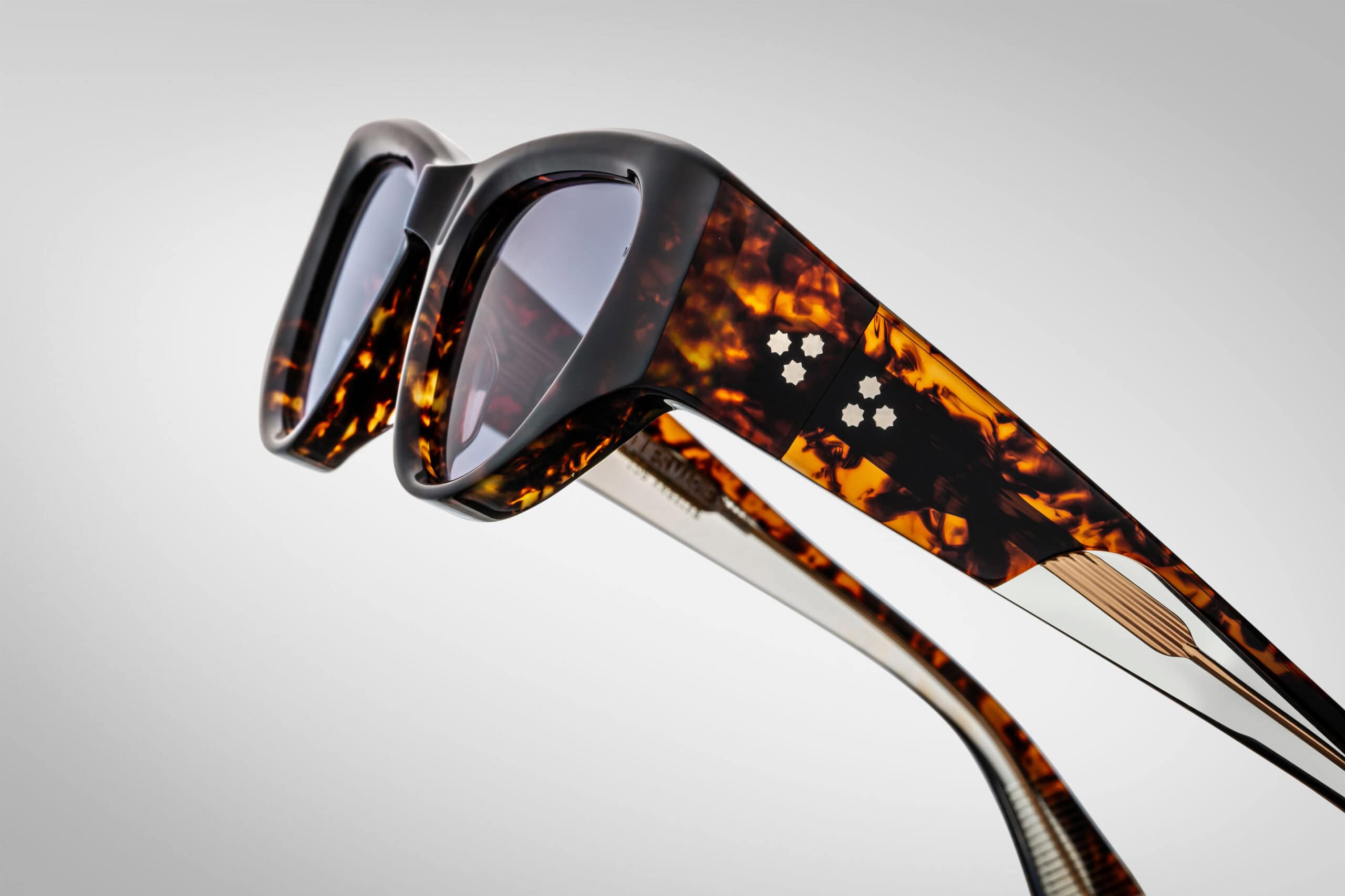Handmade in Italy from 10-millimetre premium acetate in Havana colour, the model impresses details in Light Gold, engraved Cantilever Wirecore core, and Nimbus CR39 lenses in purple with an anti-reflective coating. Every element – from the softly curved brow to the sculpted temples with metal accents – creates an image full of class and confidence.