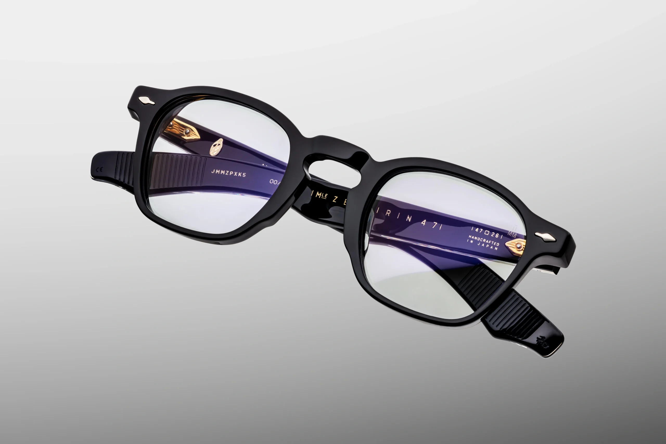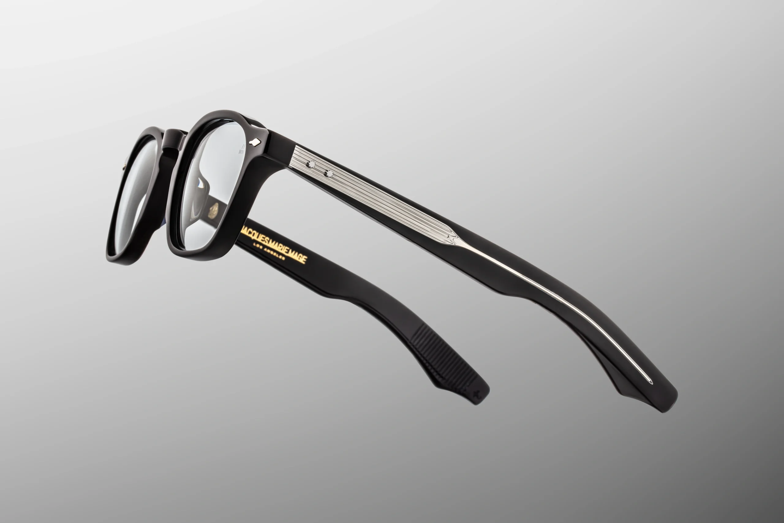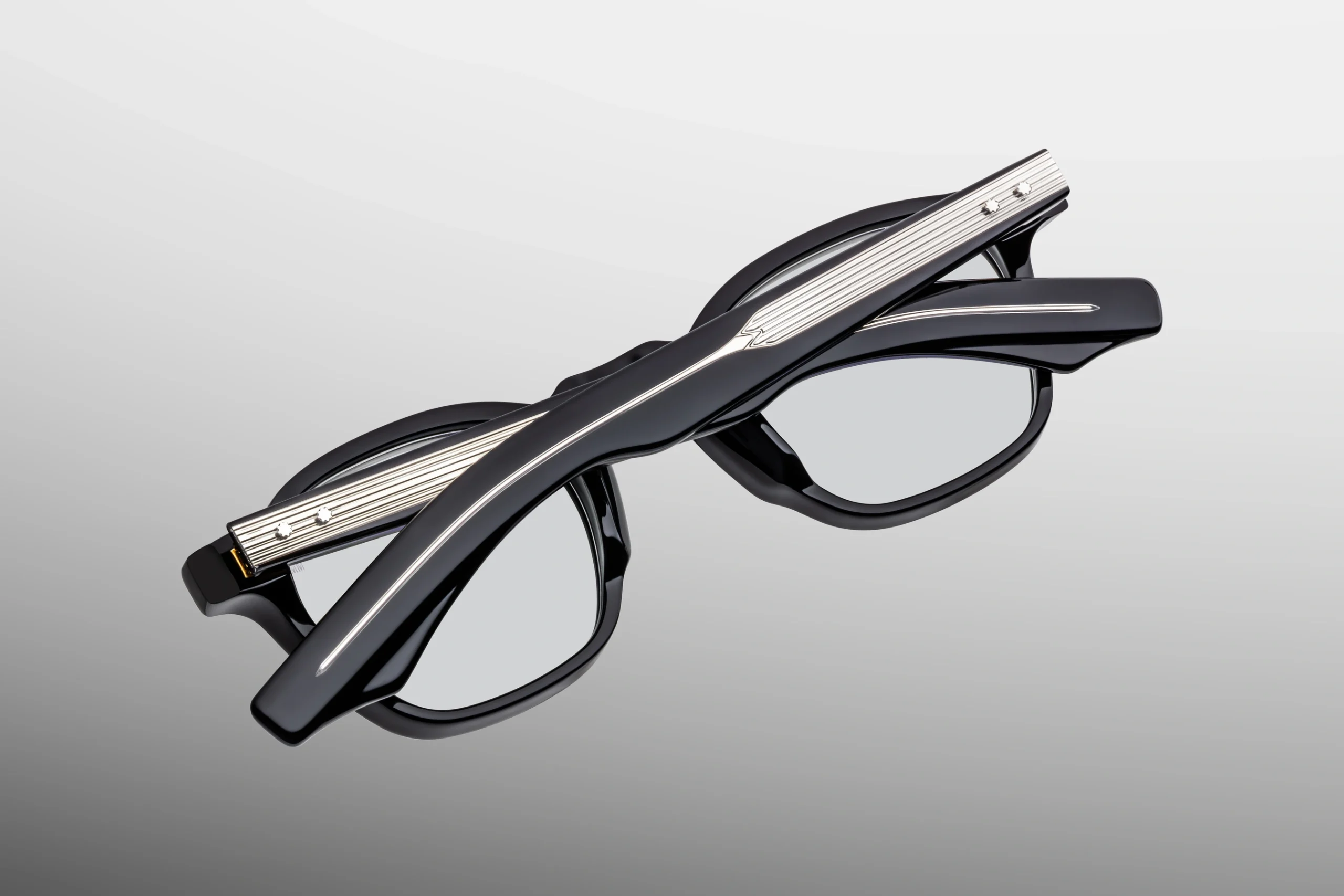 Handmade in Japan from 10 mm cured cellulose acetate In deep black, the luminaire acquires a unique structure thanks to the customised, double-laminated earcups. The whole is complemented by details from sterling silver: signed arrowhead front pins, exposed wirecore and tension-secured custom 5-barrel hinge with spur rivets. The icing on the cake is super-light blue CR39 lenses, which give the setting a fresh, visually light and collectible feel - without losing its class.
