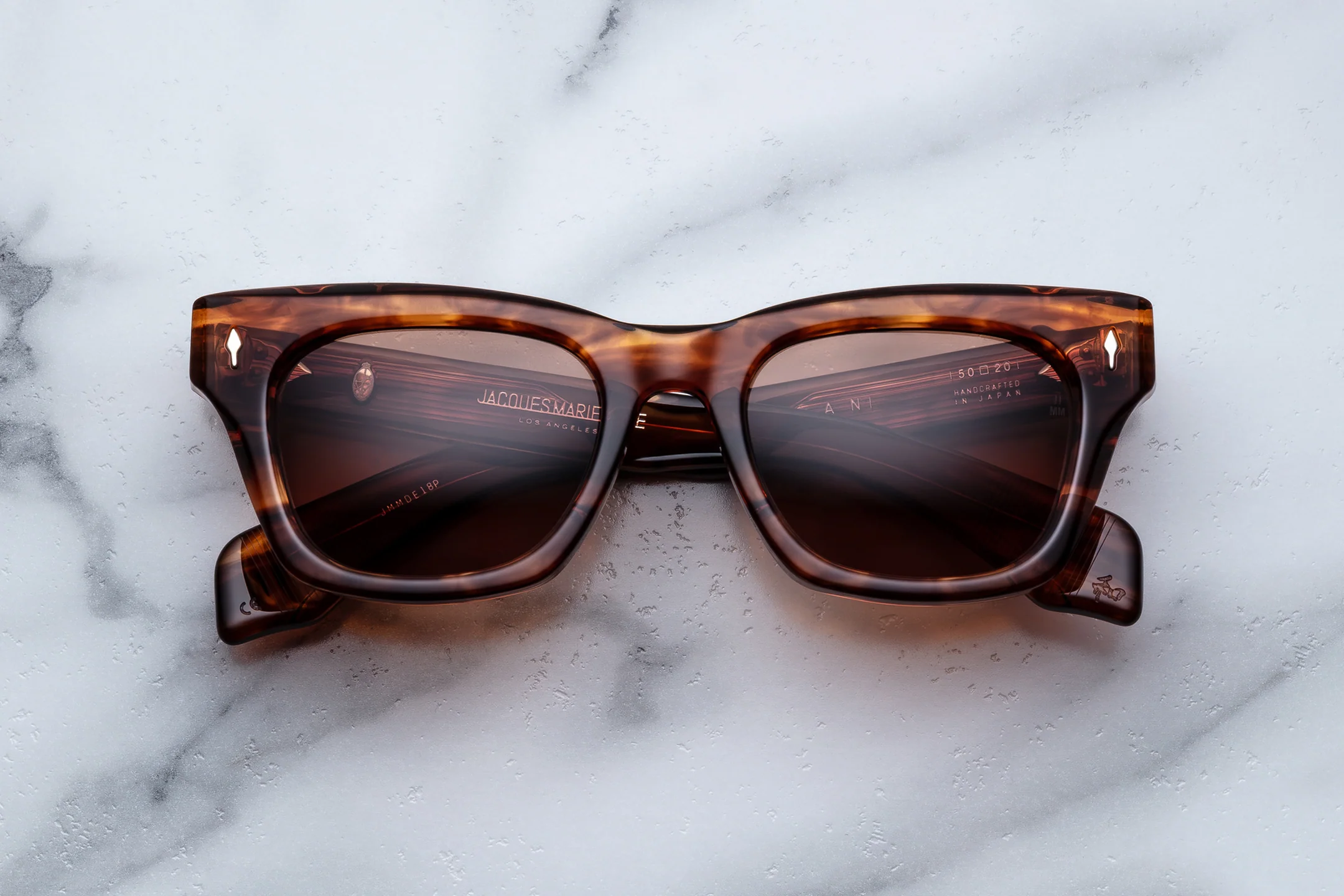Variant LONDON made of solid of 10 mm cured brown cellulose acetate, The design of the model is a combination of double-laminated temples - brown on the outside and transparent beige on the inside. This design subtly reveals the craftsmanship and emphasises the collectible nature of the model.