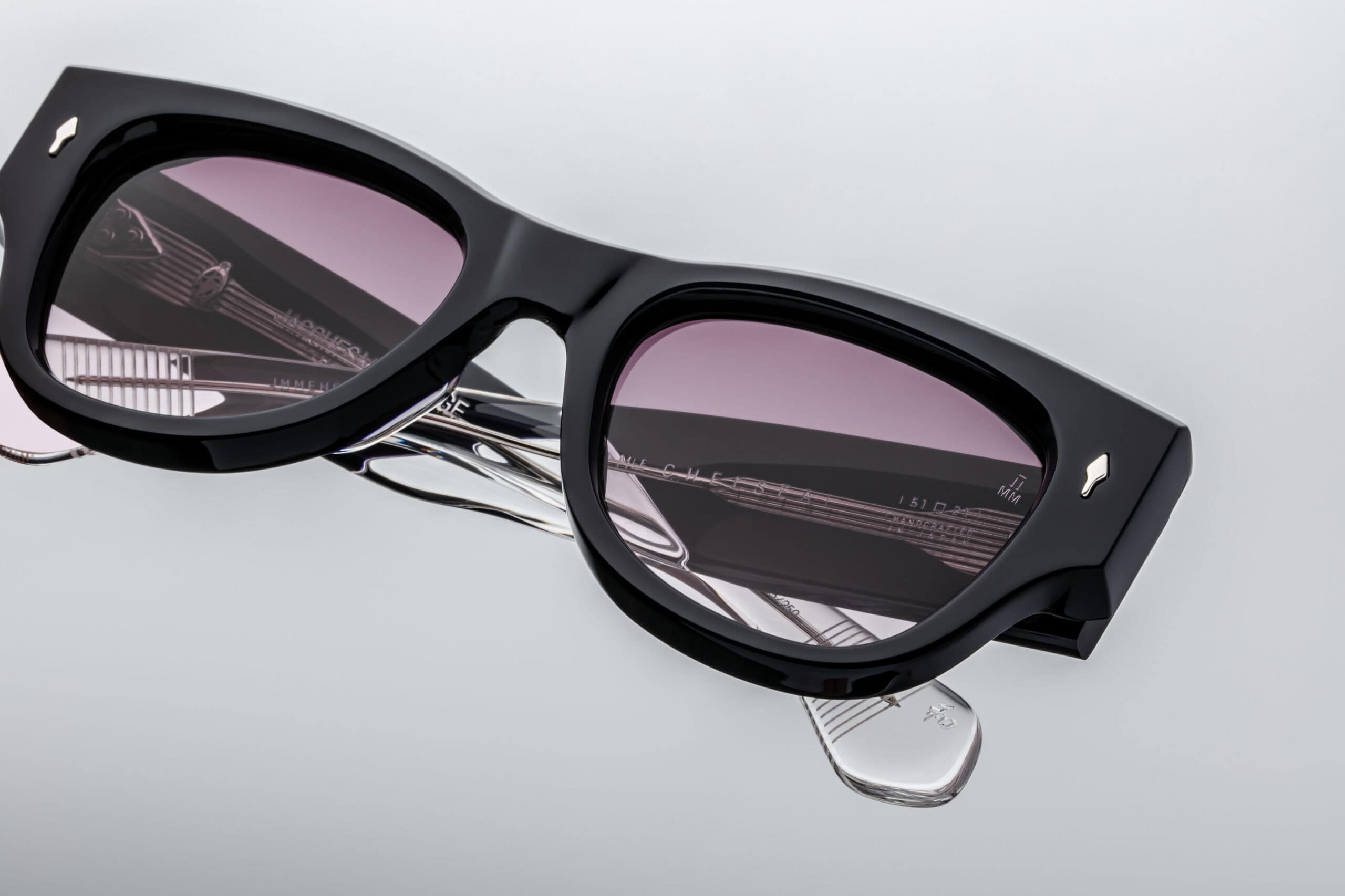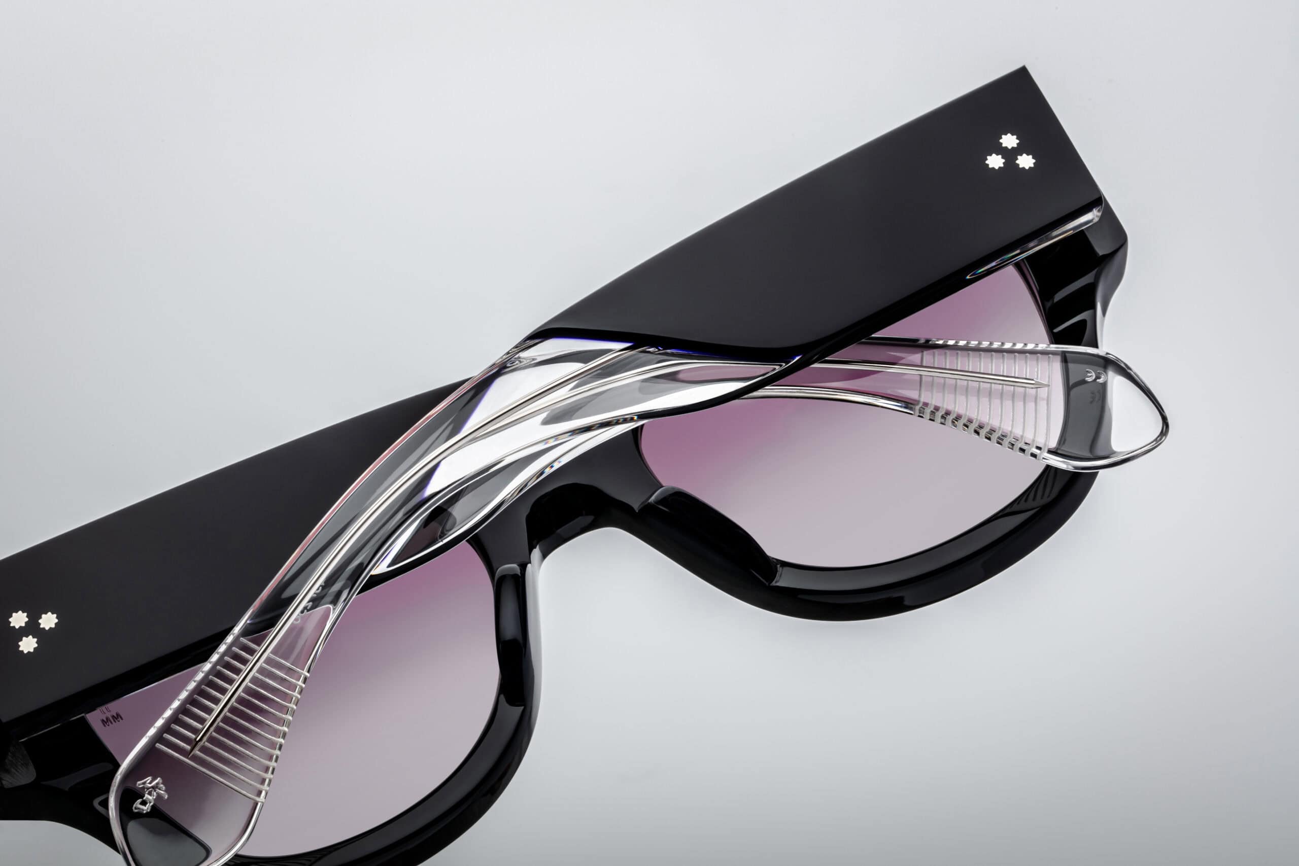 Ręcznie wykonana z 10-milimetrowego utwardzanego acetatu w odcieniu głębokiego błękitu, zachwyca dopracowanymi detalami: siedmioprętowymi zawiasami, masywnymi zausznikami oraz charakterystycznym drutem Cantilever z subtelnym grawerem typu hairline. Całość dopełniają fioletowe soczewki o gradientowym wykończeniu, nadające spojrzeniu zmysłowości i miękkiego kontrastu.