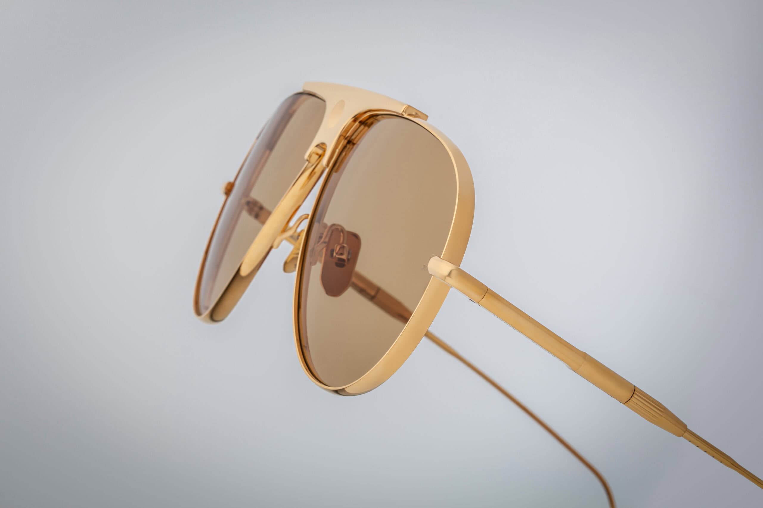 Ręcznie wykonana rama z ciemnego złota (Dark Gold), uzupełniona o brązowe soczewki, emanuje ciepłem i elegancją, a subtelne grawerowania w stylu Art Deco oraz unikalny mostek z okrągłym wgłębieniem dodają całości charakteru. To dzieło, które nie potrzebuje nadmiaru, by emanować luksusem.
