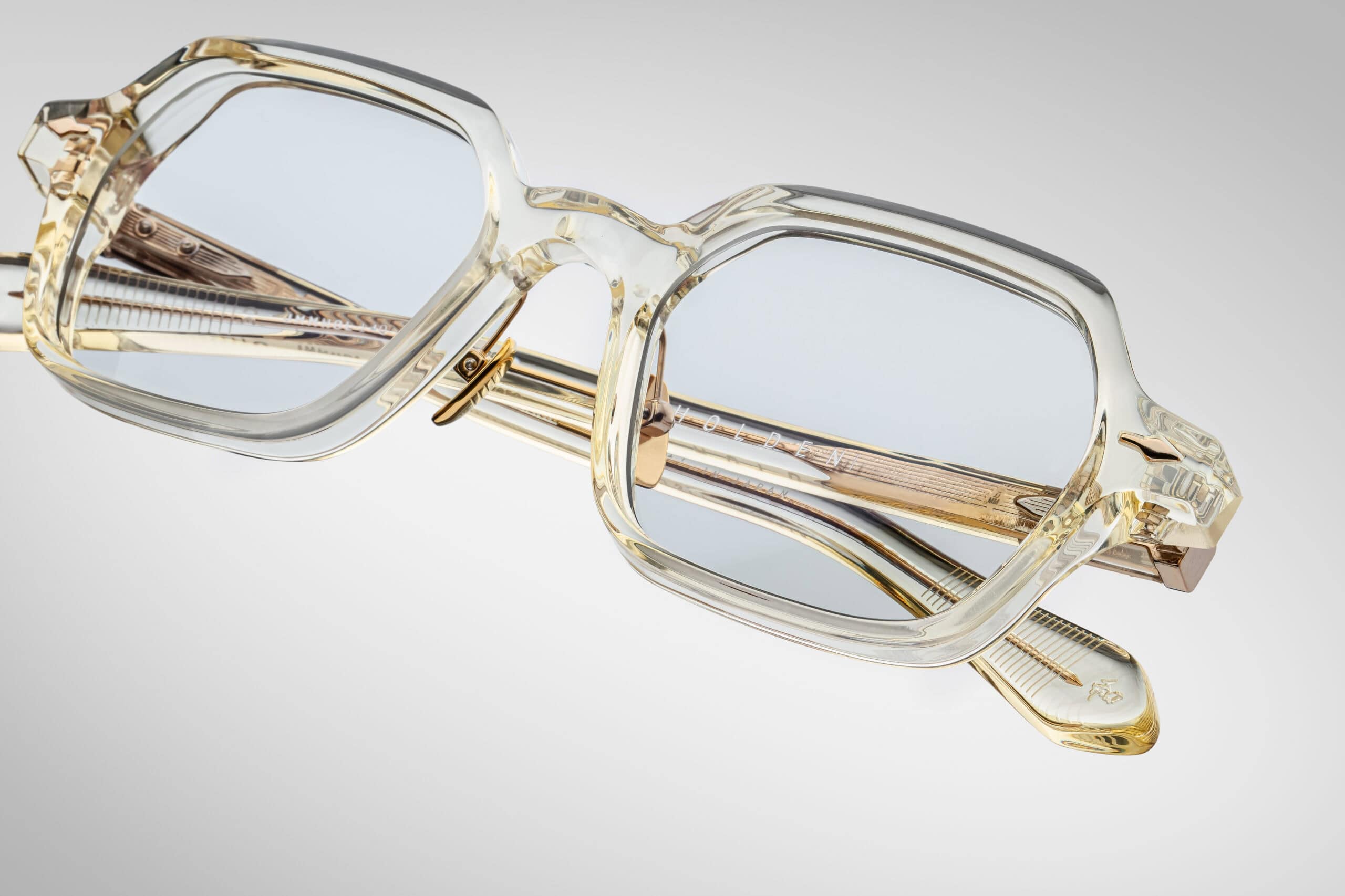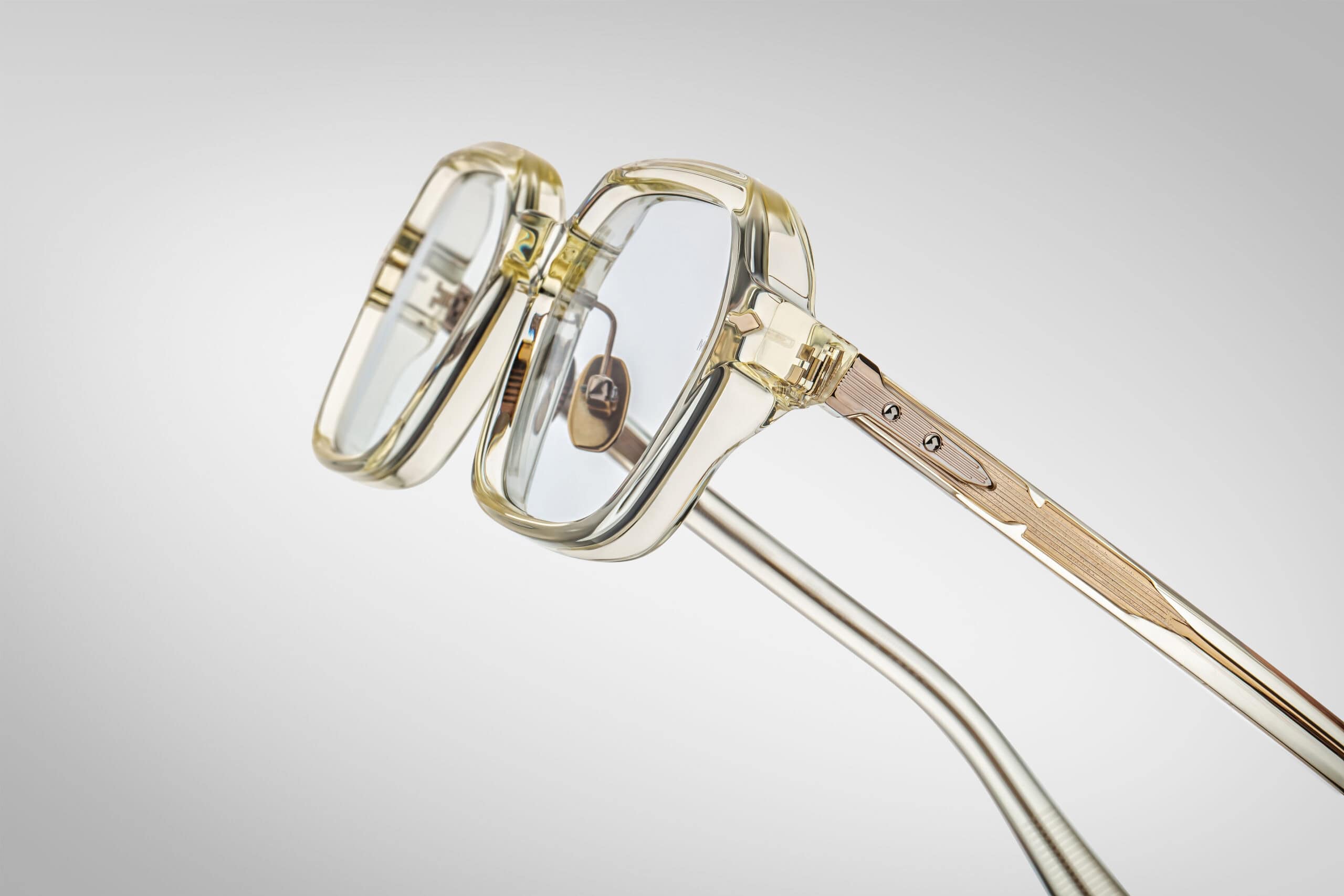 Oprawa o geometrycznym, heksagonalnym kształcie została wykonana z krystalicznego acetatu o grubości 10 mm, zdobionego dwuwarstwowymi zausznikami z metalowym rdzeniem „Blow-dart” — charakterystycznym elementem kolekcji Jacques Marie Mage.