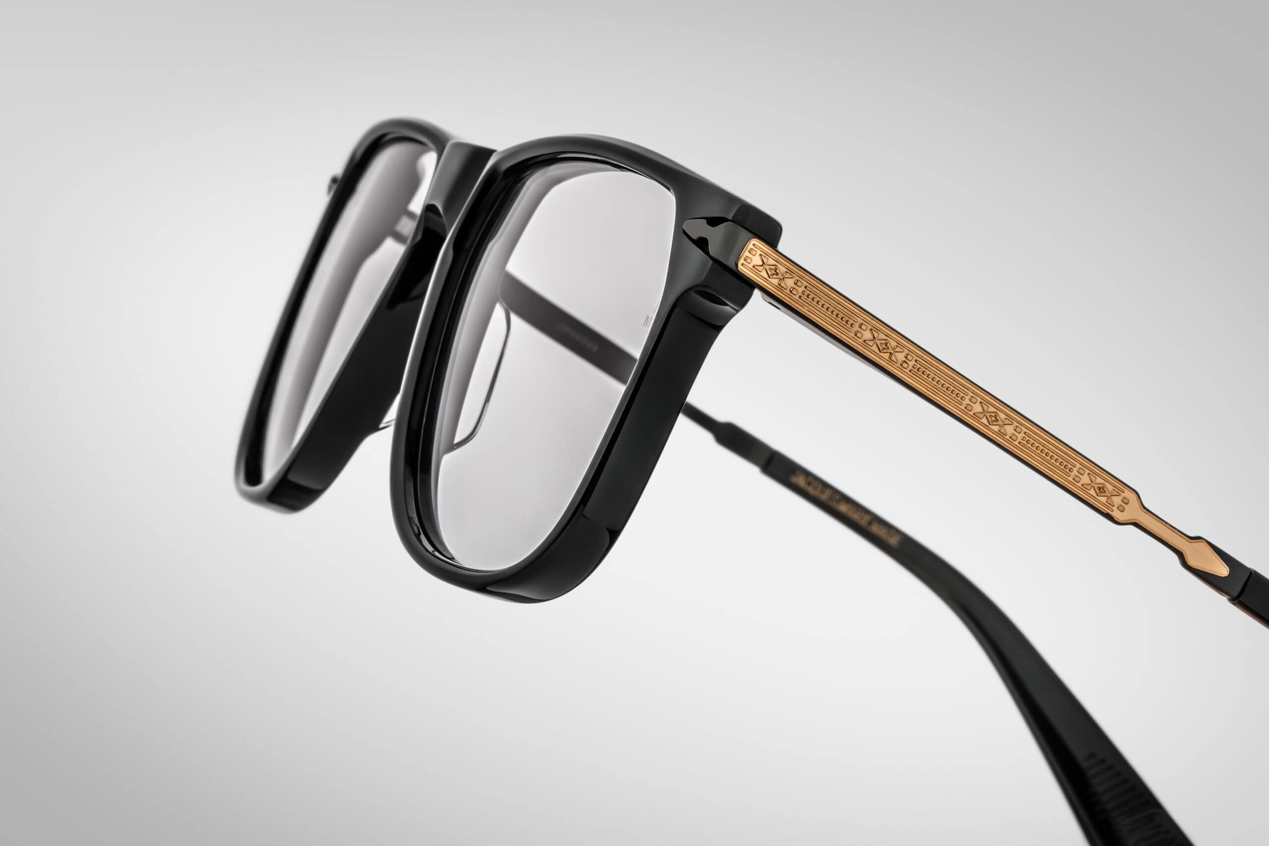 Zauszniki: z tytanu, z precyzyjnym grawerem hairline i motywem strzały – znakiem rozpoznawczym JMM