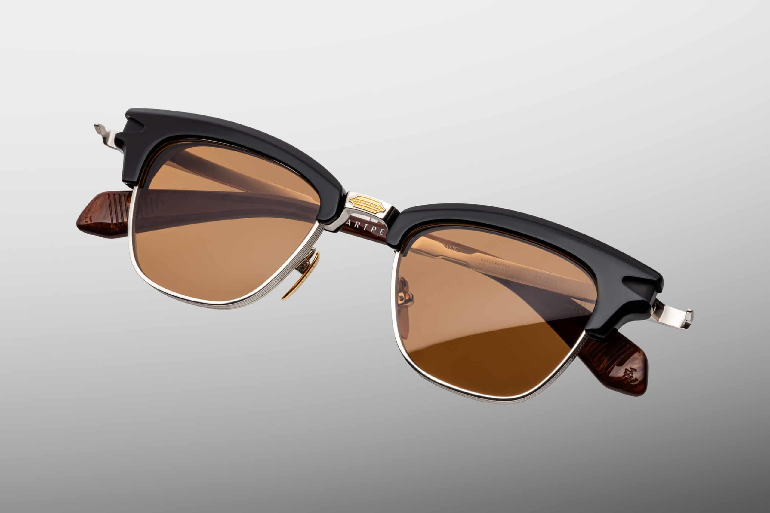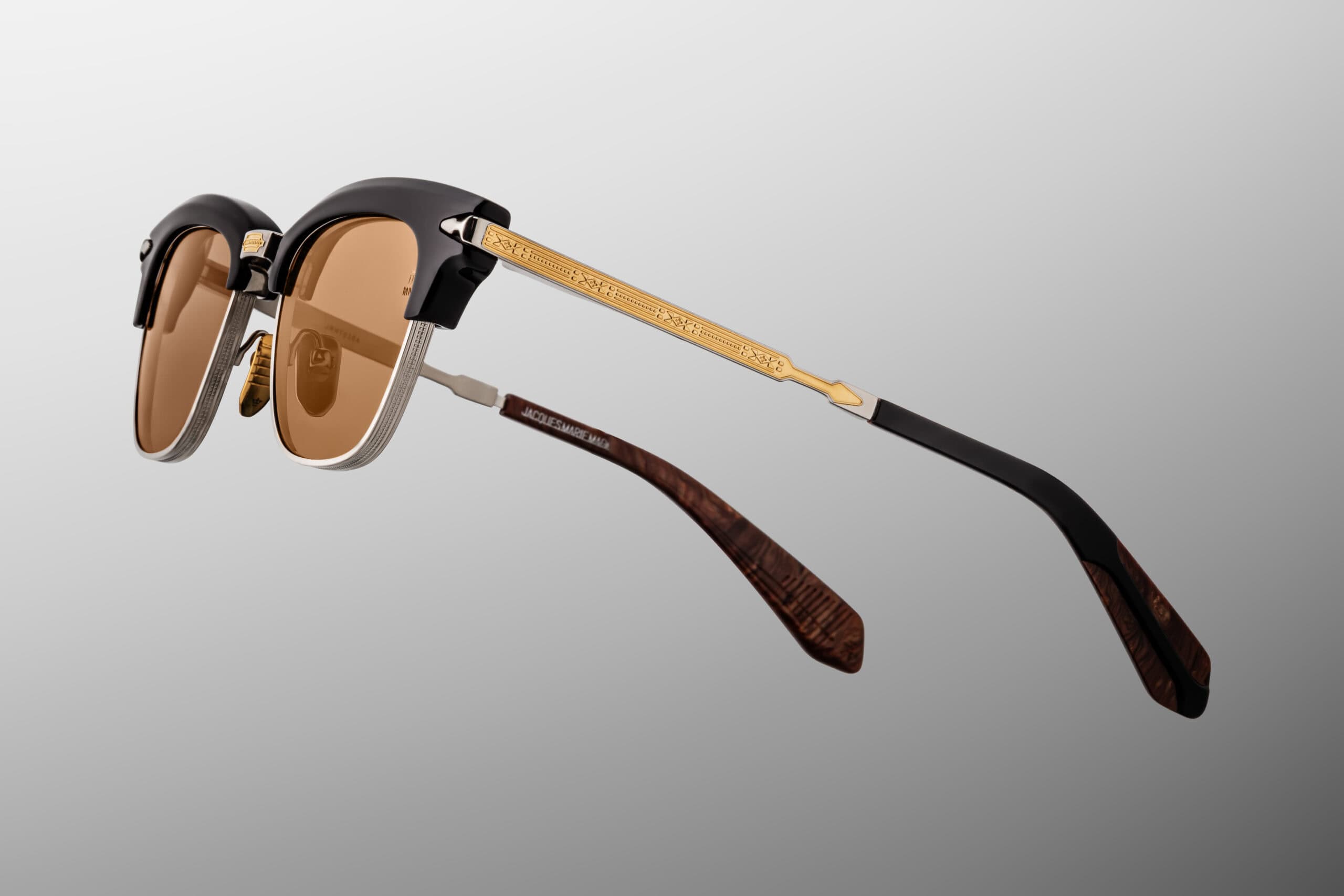 Ręcznie wykonane w Japonii z 100% tytanu klasy betautwardzanego acetatu premium, model wyróżnia się zawiasami monoblock z motywem strzały, rzeźbionymi zausznikami z tytanu oraz metalowymi detalami w tonacji srebra i Moon Gold. Całość dopełniają pomarańczowe soczewki ArmorLite 4-base z powłoką antyrefleksyjną, które dodają całości wyrafinowanego, artystycznego charakteru.